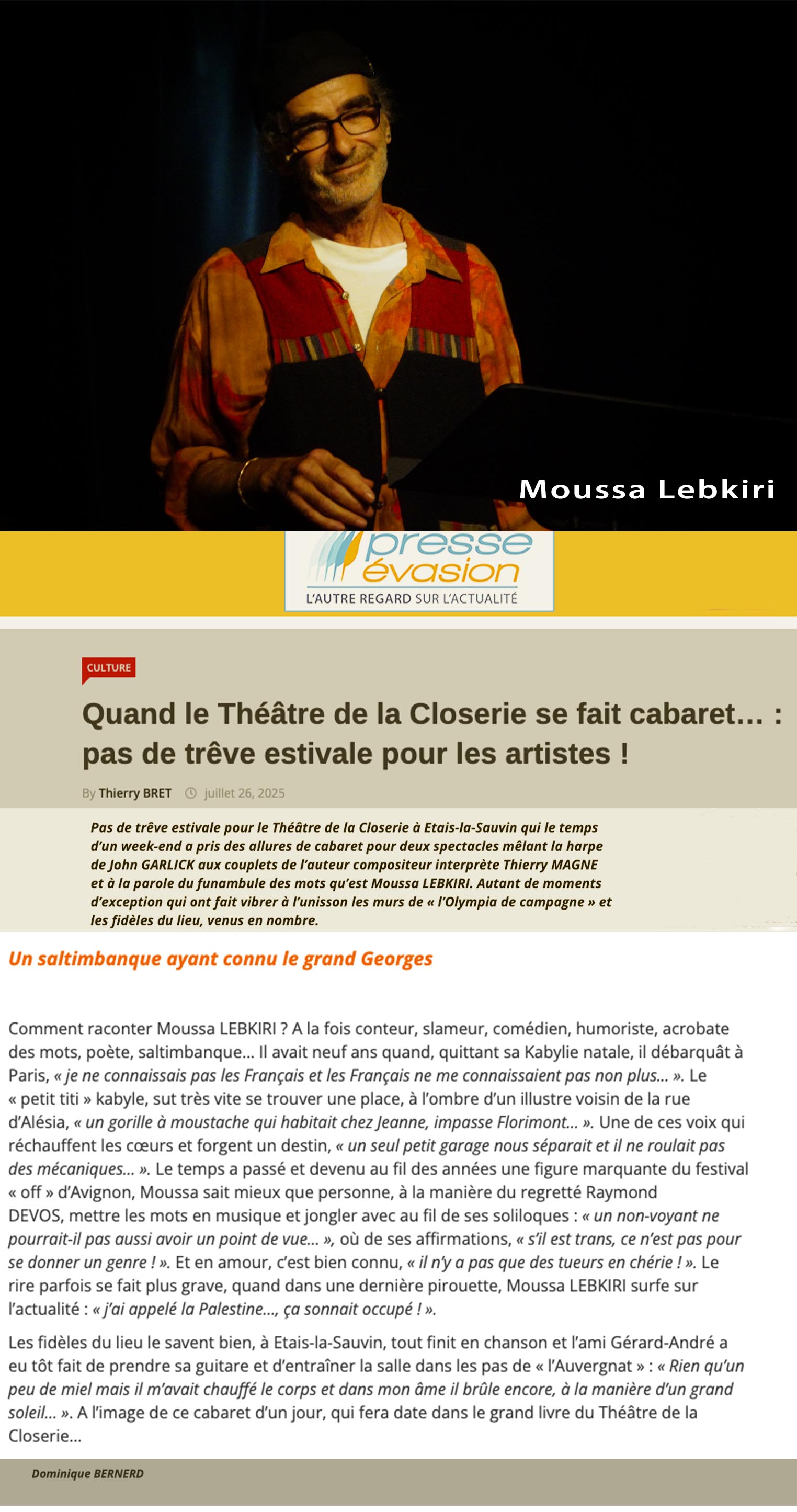 MOUSSA LEBKIRI comédien, conteur, écrivain, metteur en scène, saltimbanque, il sillonne la France, l'étranger. On le retrouve un peu partout, dans des festivals tel que celui d'Avignon où il est l'un des piliers du off depuis 1976. Il remporte divers prix pour ses textes et spectacles. Dans sa longue carrière, il a formé de nombreux jeunes au métier de comédien et à celui de conteur.